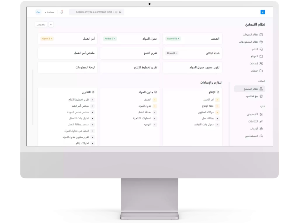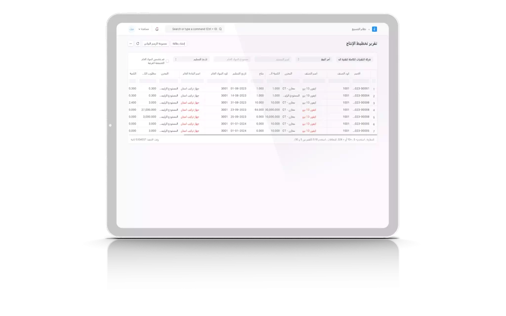 يوفر النظام مجموعة واسعة من التقارير التي تساعد في متابعة العملية الانتاجية مثل تقرير أوامر الانتاج وهو يساعدك في تتبع أوامر الانتاج بالاضافة الي تقرير تحليل الانتاج والذي يوضح كمية الانتاج في فترات محددة لجميع الاصناف او يمكنك تحليل انتاج منتج محدد في فترة محددة